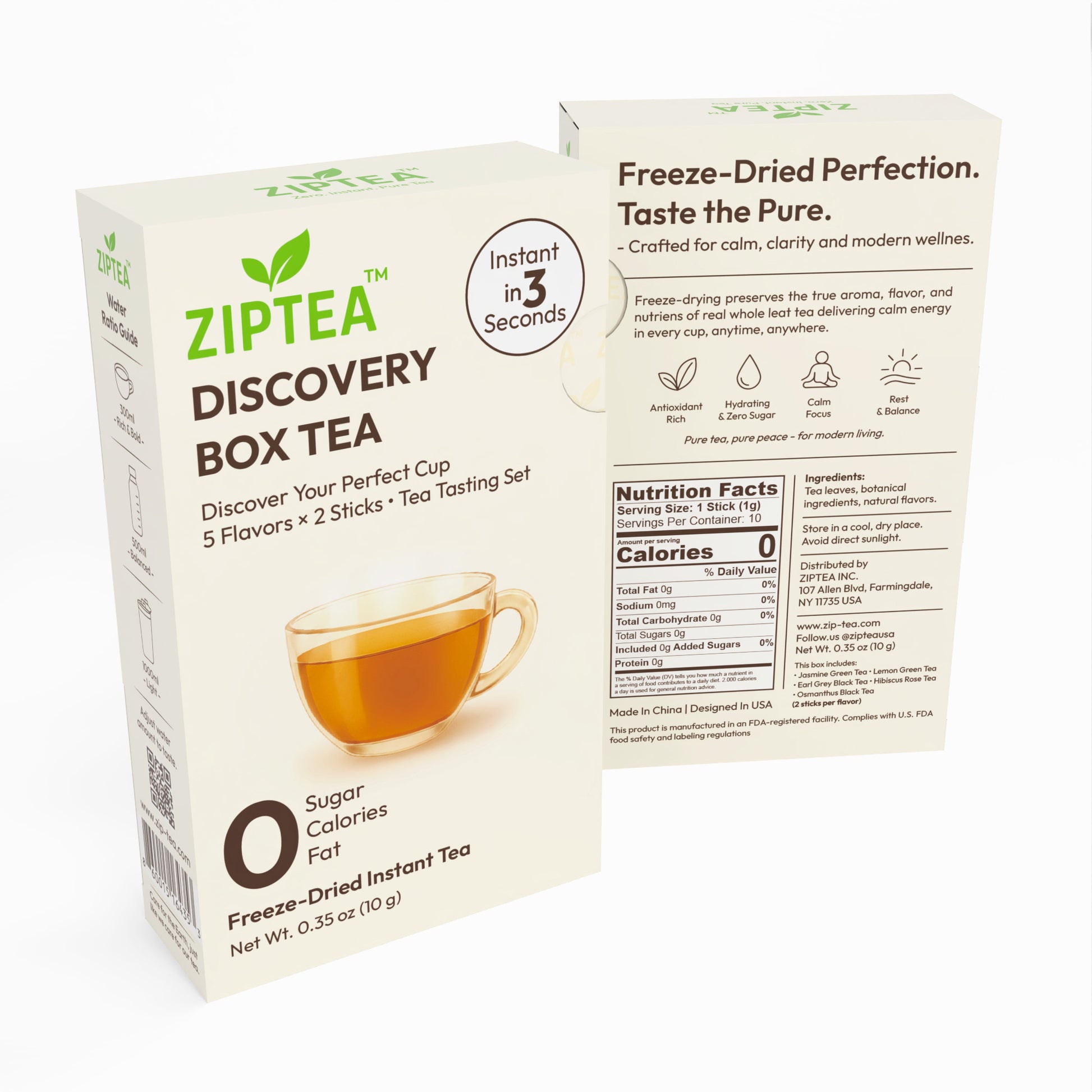 A curated tasting box featuring five of ZipTea’s signature freeze-dried teas — clean, portable, and designed to help you find your favorite flavor with ease.